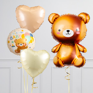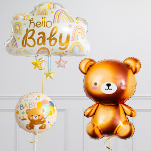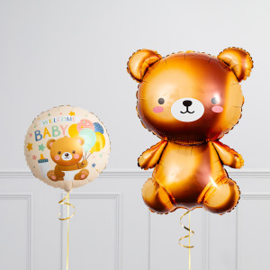 Upgrade your Bear balloon by adding a matching 18" Welcome Baby Circle balloon, 18" Heart balloons, and supersize with a 28" Hello Baby Cloud balloon.