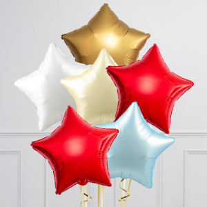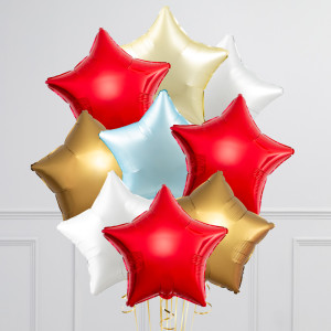 A helium-inflated bunch of 20" star balloons on ribbon and a weight