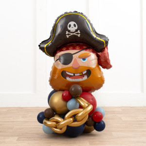 A personalised, air-inflated & freestanding, 26" Gold foil number balloon on a pirate themed biodegradable latex balloon stack.