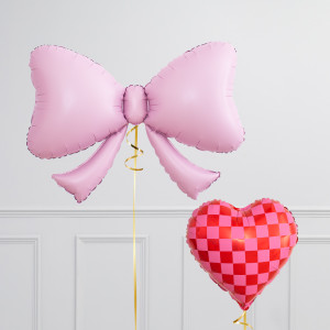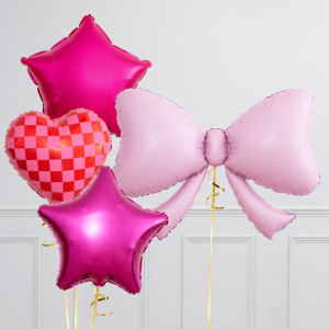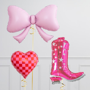 Upgrade your pink bow balloon by adding a matching 18" pink checkered circle balloon, 20" Star balloons, and supersize with a 30" Cowboy boot balloon.