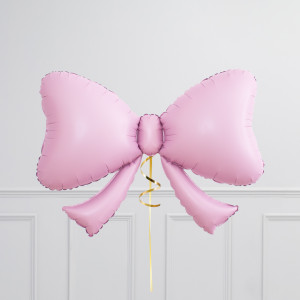 A helium-inflated 35" Pink Bow balloon balloon on ribbon and a weight