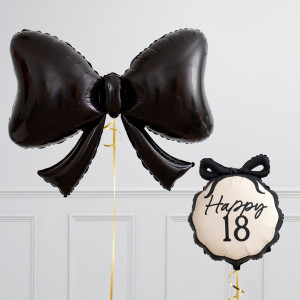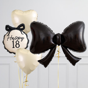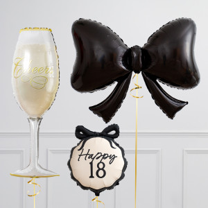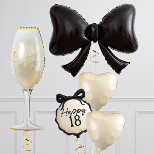 Upgrade your Black Bow balloon by adding a matching 18" Happy 18th Circle balloon, 18" ivory heart balloons, and supersize with a 30" Bubbly champagne Glass balloon.