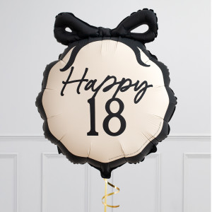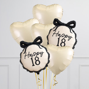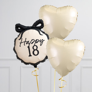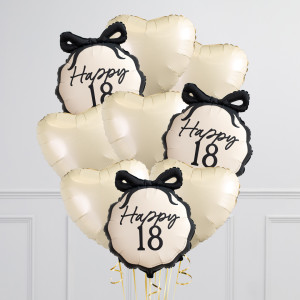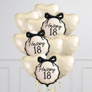 Upgrade your single 18" Happy 18th Circle balloon by adding 18" heart balloons to make a bunch of 3, 6, 9 or 12 balloons in our black bow and ivory colourway.