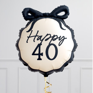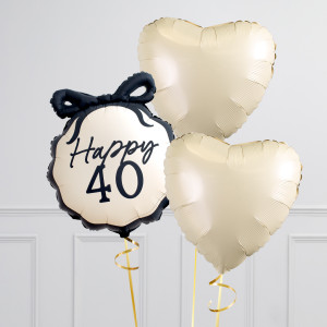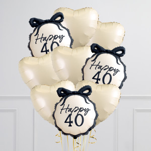 Upgrade your single 18" Happy 40th circle balloon by adding 18" Heart balloons to make a bunch of 3, 6, 9 or 12 balloons in our Black Bow Ivory colourway.