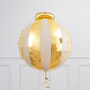 A helium-inflated 24" Gold & Cream Bauble balloon on ribbon and a weight