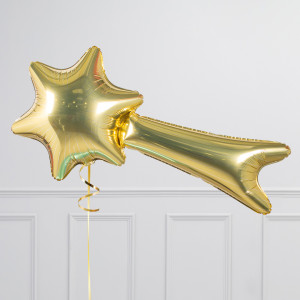 A helium-inflated 40" Gold Shooting Star balloon on ribbon and a weight