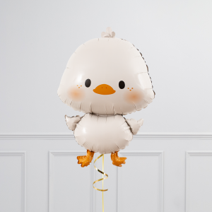 A helium-inflated 25" Cute White Duckling balloon on ribbon and a weight