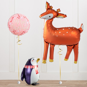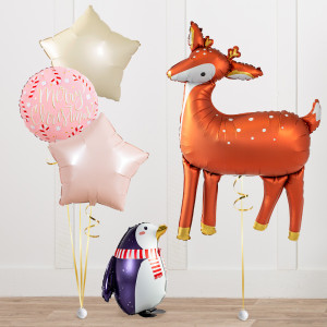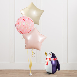 Upgrade your cute little penguin friend by adding a matching 18" pink Merry Christmas circle balloon, 20" star balloons, and supersize with a 41" Reindeer balloon.