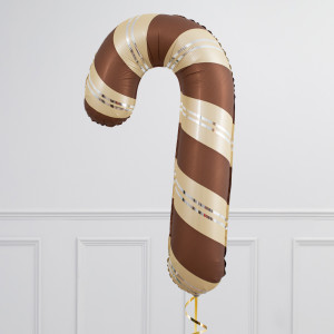 A helium-inflated 35" Chocolate Candy Cane balloon on ribbon and a weight