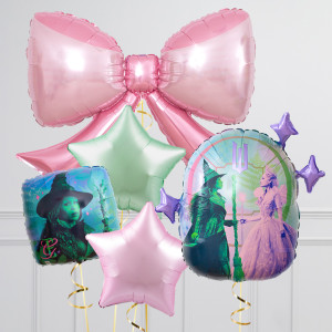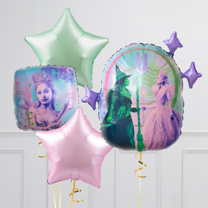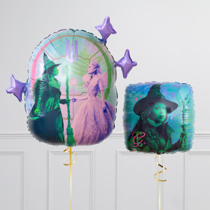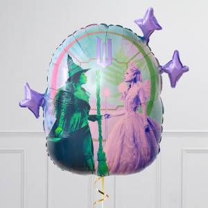 A helium-inflated 26" Wicked for Good balloon on ribbon and a weight