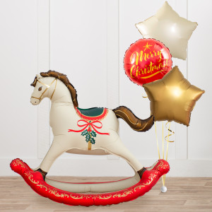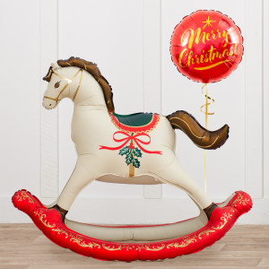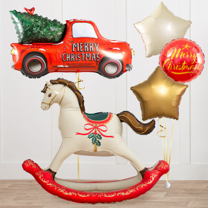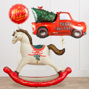 Upgrade your rocking horse balloon by adding a matching 18" merry christmas circle balloon, 20" star balloons, and supersize with a 47" Christmas Truck balloon.