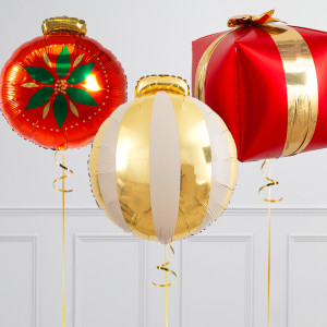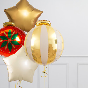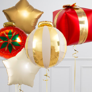 Choose your bunch size - starting from a single Gold Buable balloon, up to a set of five that includes a matching 20" Red Bauble balloon, 20" star balloons, and a 19" 3D Red Present balloon.