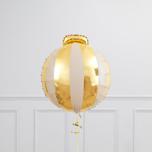 A personalised, helium-inflated 24" Gold Stripey Bauble balloon on ribbon and a weight