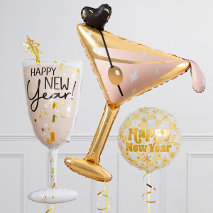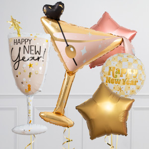 Upgrade your Bubbly Champagne Glass balloon by adding a matching 18" Gold Happy New Year circle balloon, 20" star balloons, and supersize with a 39" Martini Glass balloon.