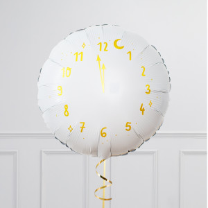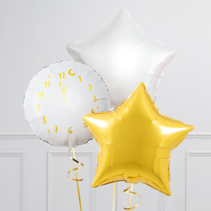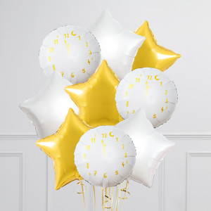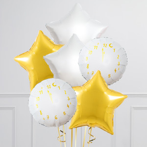 Upgrade your single 18" White New Year's Eve Clock circle balloon by adding 20" star balloons to make a bunch of 3, 6, or 9 balloons in our white and gold colourway.