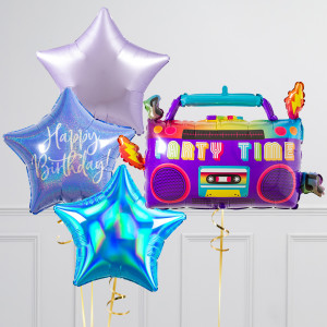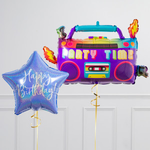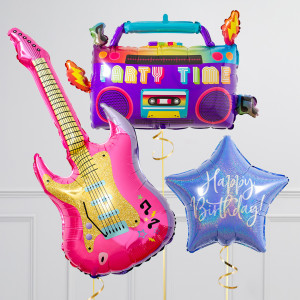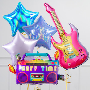 Upgrade your Boom Box balloon by adding a matching 18" Happy Birthday Blue Star balloon, 20" star balloons, and supersize with a 39" Pink Electric Guitar balloon.