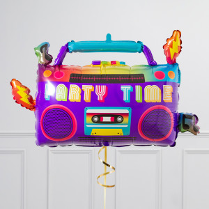 A helium-inflated 29" Boom Box balloon on ribbon and a weight