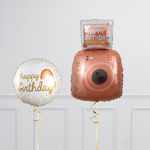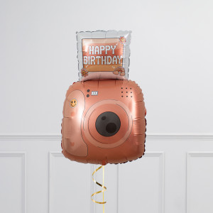 A helium-inflated 24" Polaroid Camera Happy Birthday balloon on ribbon and a weight