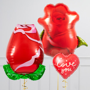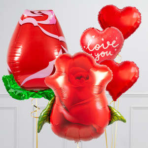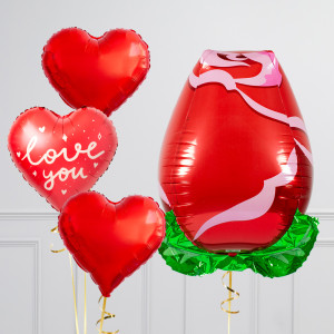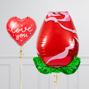 Upgrade your Rose balloon by adding an 18" Love You heart balloon, 18" red heart balloons, and supersize with a 33" Rose balloon.