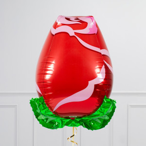 A helium-inflated 3D 33" Rose Bud balloon on ribbon and a weight