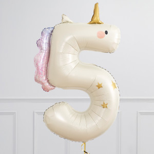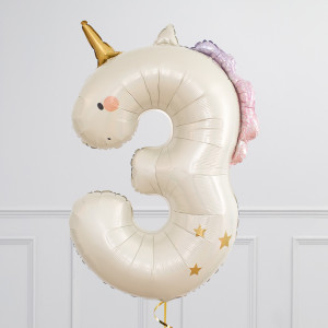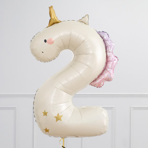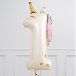 A helium-inflated 36" Unicorn Number balloon on ribbon and a weight. Available in numbers 1 to 5