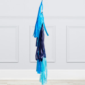 A helium-inflated 24" Space themed bubble balloon filled with mini 5" balloons in Navy, Aura ice Blue, Pastel Dusk Blue, Red and Yellowl on a tail and a weight in your design of choice.