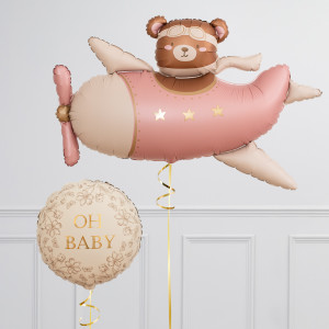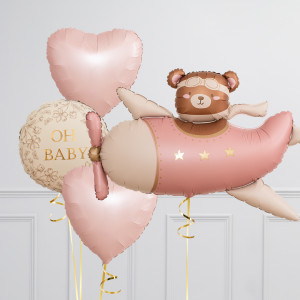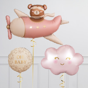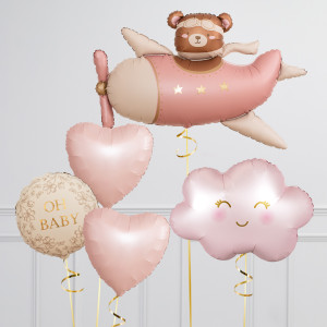 Upgrade your Airplane balloon by adding a matching 18" "Hello Baby" round balloon, 18" baby pink Hearts balloons, and supersize with a 30" Blue Cloud balloon.