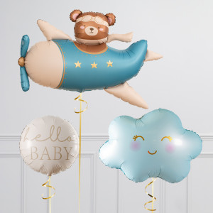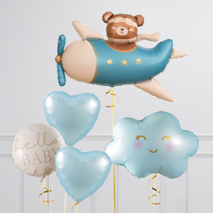 Upgrade your Airplane balloon by adding a matching 18" "Hello Baby" round balloon, 18" Baby Blue Heart balloons, and supersize with a 30" Baby Blue Cloud balloon.