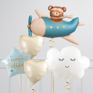 Upgrade your Airplane balloon by adding a matching 18" Happy Birthday Star balloon, 18" cream Hearts balloons, and supersize with a 30" Cloud balloon.