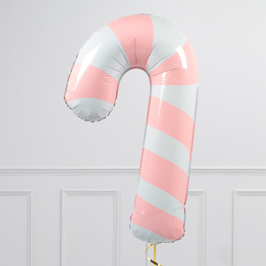 A helium-inflated 41" Pink Christmas Candy Cane balloon on ribbon and a weight
