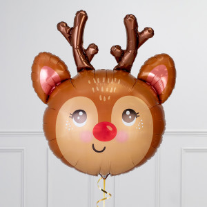 A helium-inflated 35" Cute Reindeer balloon on ribbon and a weight