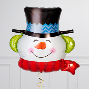 A helium-inflated 35" Snowman Head balloon on ribbon and a weight
