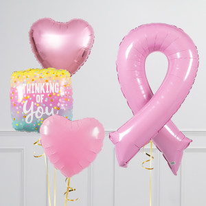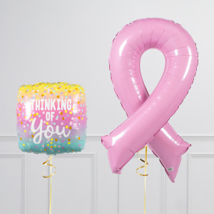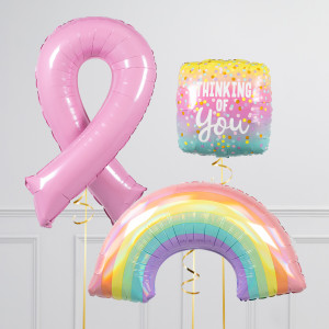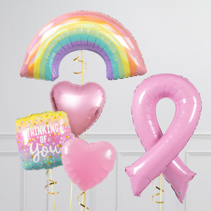 Upgrade your Breast Cancer Awareness balloon by adding a matching 18" Thinking of You square balloon, 18" heart balloons, and supersize with a 34" holographic rainbow balloon.