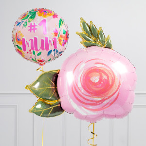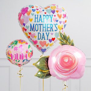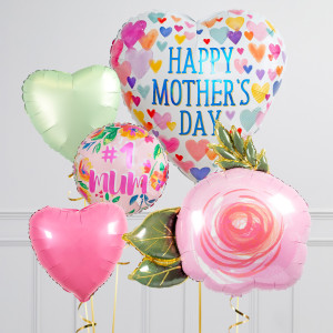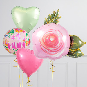 Upgrade your Rose balloon by adding a matching 18" Floral No.1 Mum circle balloon, 18" heart balloons, and supersize with a 28" Happy Mother's Day Heart balloon.