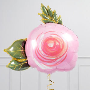 A helium-inflated 30" Pink Rose balloon on ribbon and a weight