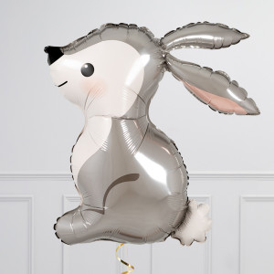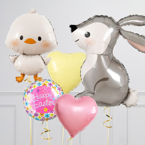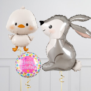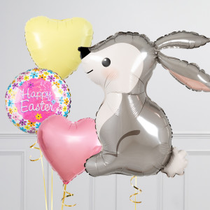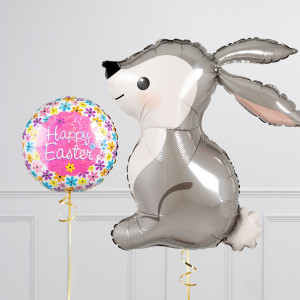 Upgrade your Cute Grey Bunny balloon by adding a floral 18" Happy Easter round balloon, 18" heart balloons, and supersize with a 25" Spring Duckling balloon.