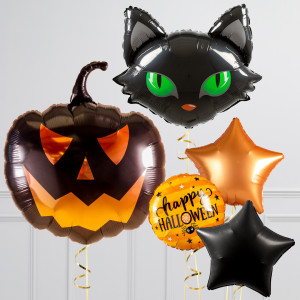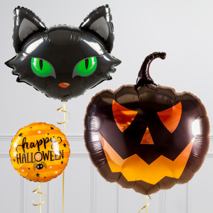 Upgrade your Scary Pumpkin balloon by adding a matching 18" Happy Halloween circle balloon, 20" star balloons, and supersize with a 28" Spooky Cat Head balloon.