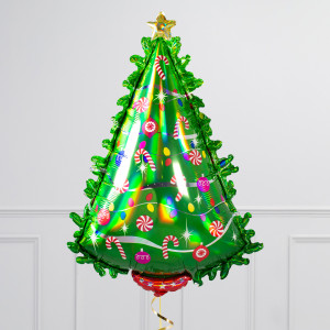 A helium-inflated 36" Holographic Christmas Tree balloon on ribbon and a weight