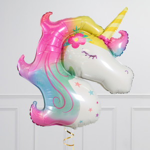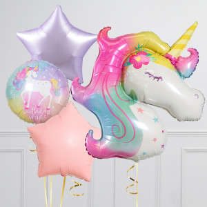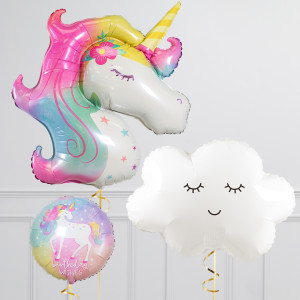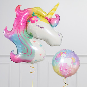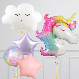 Upgrade your unicorn balloon by adding a matching 18" unicorn birthday wishes circle balloon, 20" pastel star balloons, and supersize with a 28" White Cloud balloon.