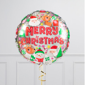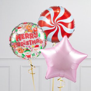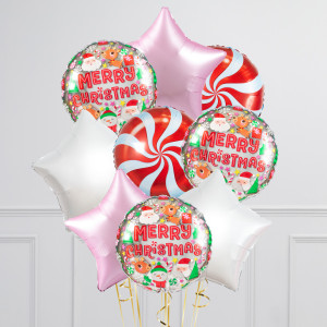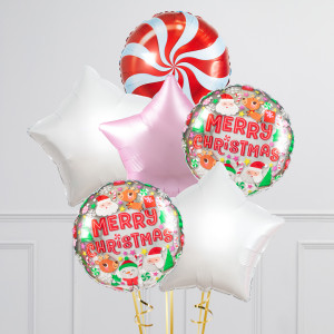 Upgrade your single 18" Merry Christmas Cute Characters circle balloon by adding white & pink 20" star balloons and 18" red candy swirl balloons to make a bunch of 3, 6, or 9.