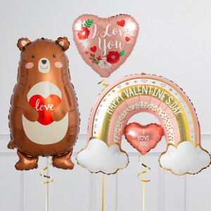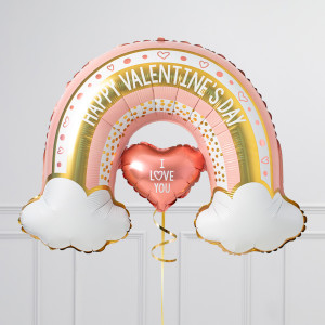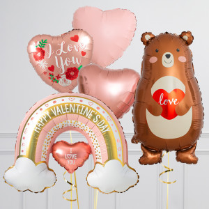 Upgrade your Valentine Rainbow balloon by adding a rose gold 18" I Love You heart balloon, 18" heart balloons, and supersize with a 31" Love Teddy Bear balloon.
