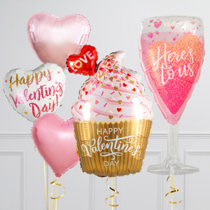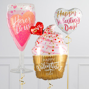 Upgrade your Pink & Gold Valentine's Cupcake balloon by adding a 18" Happy Valentine's Day heart balloon, 18" heart balloons, and supersize with a 37" Here's To Us Champagne Glass balloon.