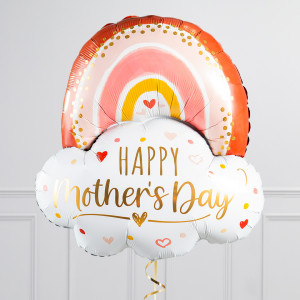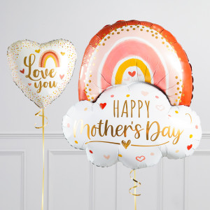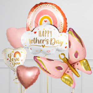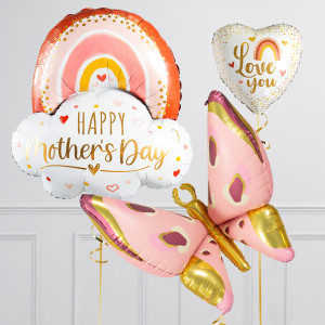 Upgrade your Happy Mother's Day rose gold rainbow balloon by adding a matching 18" Love You heart balloon, 20/18" SHAPE balloons, and supersize with a 43" Butterfly balloon.