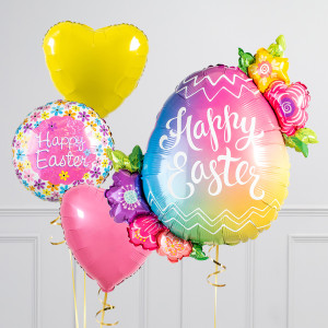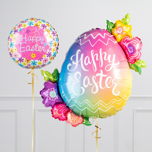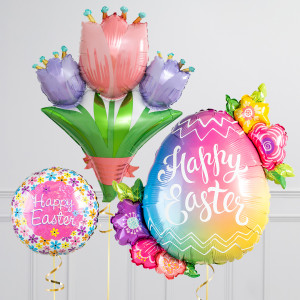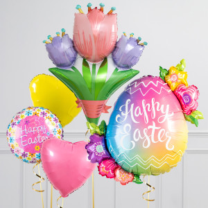 Upgrade your Easter Egg balloon by adding a floral 18" Happy Easter round balloon, 18" heart balloons, and supersize with a 31" Tulip Bunch balloon.