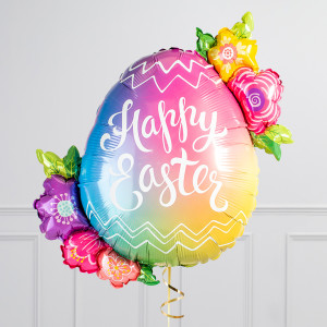 A helium-inflated 35" Happy Easter Floral Egg balloon on ribbon and a weight