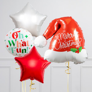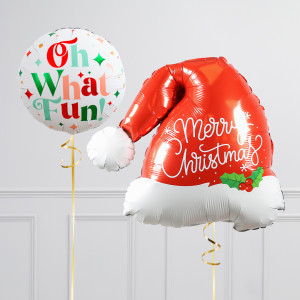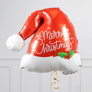 A helium-inflated 41" Santa's Hat balloon on ribbon and a weight