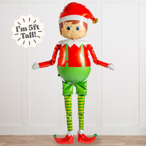 A helium-inflated 66" Christmas Elf balloon on ribbon and a weight