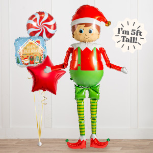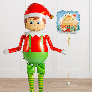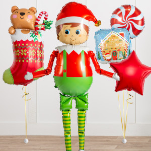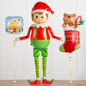Upgrade your life-sized Elf balloon by adding a matching 18" Happy Holidays Santa's Workshop square balloon, 20" star & 18" candy swirl balloons, and supersize with a 32" Bear in a Stocking balloon.