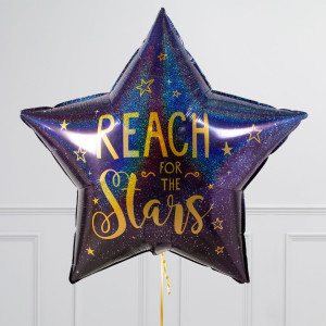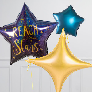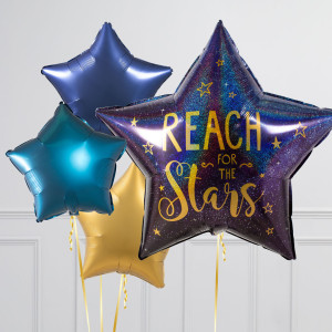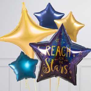 A helium Reach For The Stars balloon-in-a-box arriving inflated via the post! The perfect "you can do it" gift or congratulations party decoration. You can order just the Reach for the Stars balloon supershape or go all the way up to the full package with 15 x blue mini balloons and 3 coordinating star foil balloons.