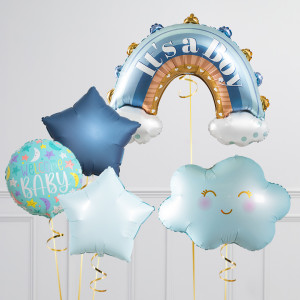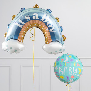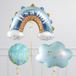 Upgrade your It's a Boy! rainbow balloon by adding a matching 18" Sweet Baby round balloon, 20/18" SHAPE balloons, and supersize with a 24" cloud balloon.
